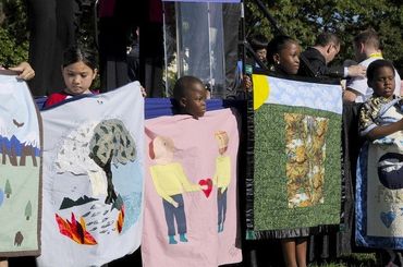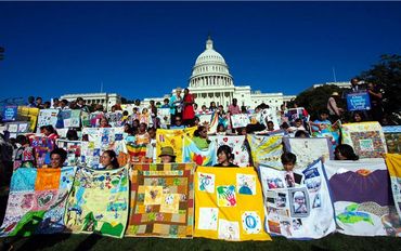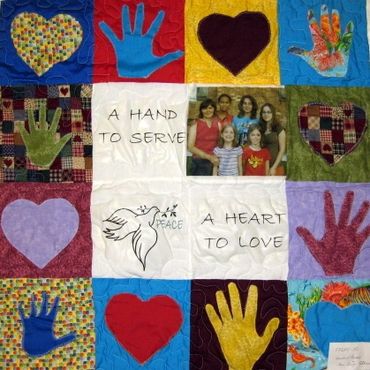 The Children's Cloth of Many Colors was initiated by an eight year old girl when our organization dedicated a peace pole for the Pentagon. Based on a concept initiated by "Peace Troubadour" Jimmy Twyman, the project is comprised of yard-square sections made by groups of children. With its initial focus on peace, the project has grown to include sections from thousands of children in 32 countries. It has made a significant difference in the lives of many people, and has even been said to create "miracles" by major media sources.
